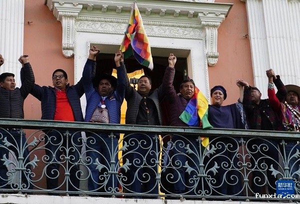 6月26日,在玻利维亚拉巴斯,玻利维亚总统阿尔塞(左四)向民众致意。新华社发(哈维尔·马马尼摄)