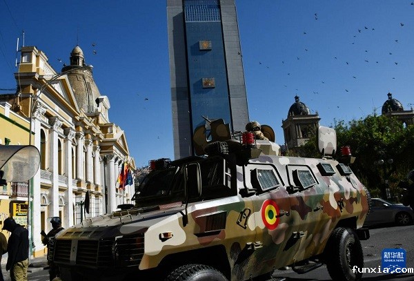 6月26日,在玻利维亚拉巴斯,军用车辆停在总统府附近的街道上。新华社发(罗伯托·阿兰达摄)